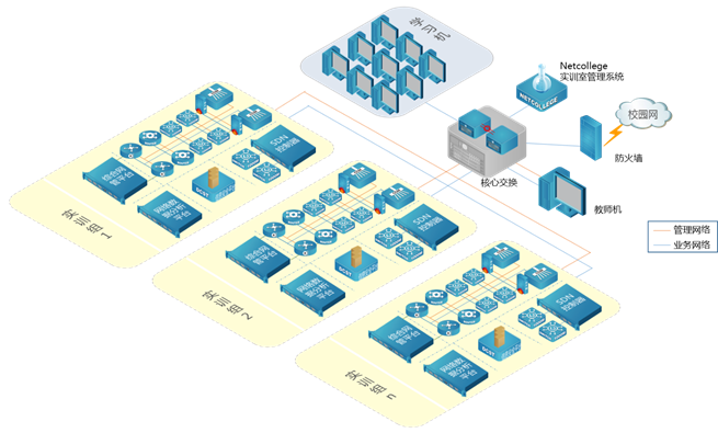 为了提高实训室的利用效率,科研人员和培训学院在使用时,一般是分期、分批的方式使用。那么这对实训平台和科研进度、教学进度带来一定挑战。比如实训室可以分成多个实训小组,每个小组对自己的实训设备拥有控制权限,而不应该干扰其他实训小组的工作;一个实训小组在利用完设备后,下一个小组将会对这些设备进行全新的配置,那么就应该在第二个小组回到实训室后,统一将设备配置状态恢复到上一次的科研进度;由于晚上做实训的人比较少,可以利用开放远程实训的方式,允许科研人员从实训室外(家中、宿舍、外地宾馆……)远程访问实训室,并且对访问权限和安全性进行控制。